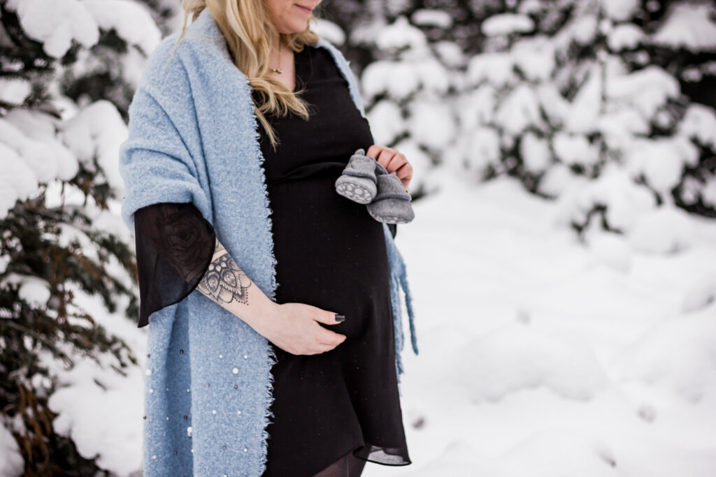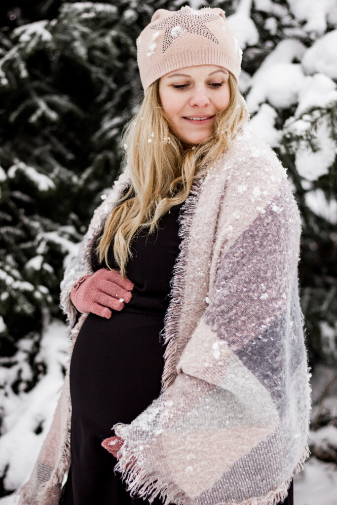 Trotz der winterlichen Kälte und des Schnees hat das Babybauchshooting mit Maxi eine ganz sinnliche Atmosphäre eingefangen, die die Vorfreude auf ihr kommendes Baby auf magische Weise widerspiegelt. Denn auch im Winter bietet die verschneite Landschaft eine einzigartige Kulisse, die eine romantische und zugleich verträumte Stimmung schafft. Durch die schneeweiße Umgebung entstehen ideale Lichtverhältnisse, die die natürliche Schönheit von Maxi und ihre liebevolle Vorfreude auf ihr Baby wunderbar unterstreichen. Es zeigt, dass ein Babybauchshooting nicht nur im Sommer bei strahlendem Sonnenschein seine Reize hat, sondern auch im Winter eine zauberhafte und unvergessliche Erinnerung schaffen kann.